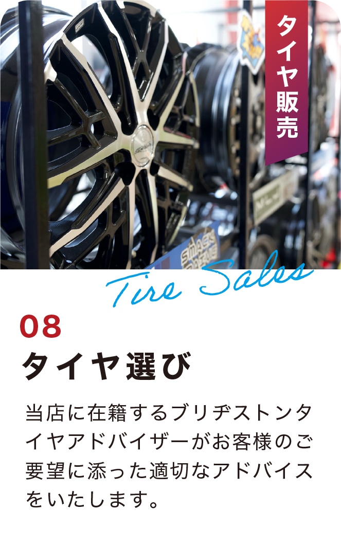 乗用車からトラック、農耕用、建設機械の車両までタイヤの専門店として、販売だけでなく修理・メンテナンスまですべてお任せください。その他、アルミホイール、カー用品まで是非ご相談ください。
