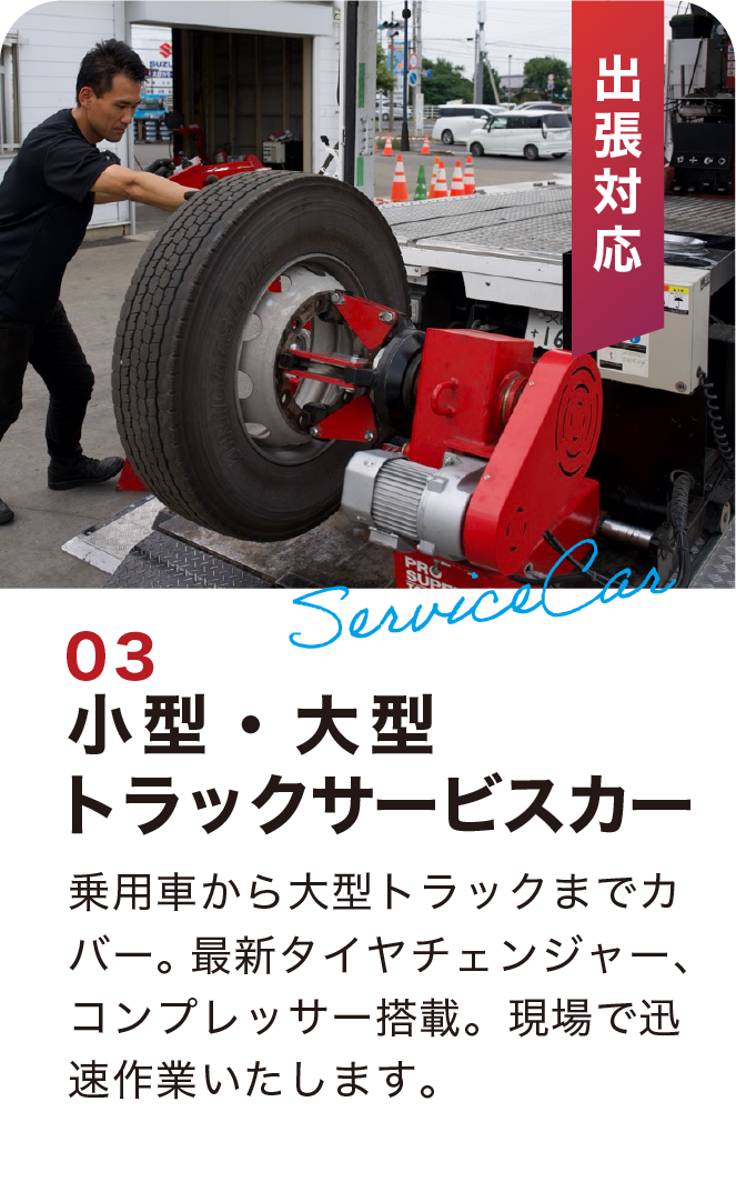 大小のトラックサービスカー(チェンジャー、コンプレッサー搭載)を所持しておりますので、車両に合わせて現場へ、直行し迅速に作業致します。