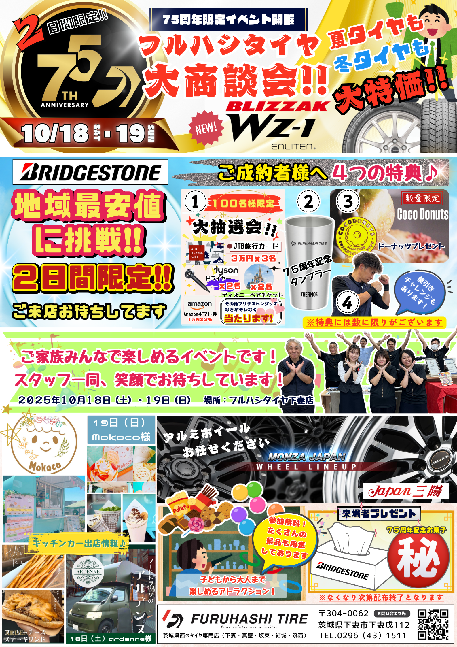 🚗【創業75周年記念】フルハシタイヤ大商談会開催!下妻でブリヂストンタイヤをお得に交換するチャンス✨