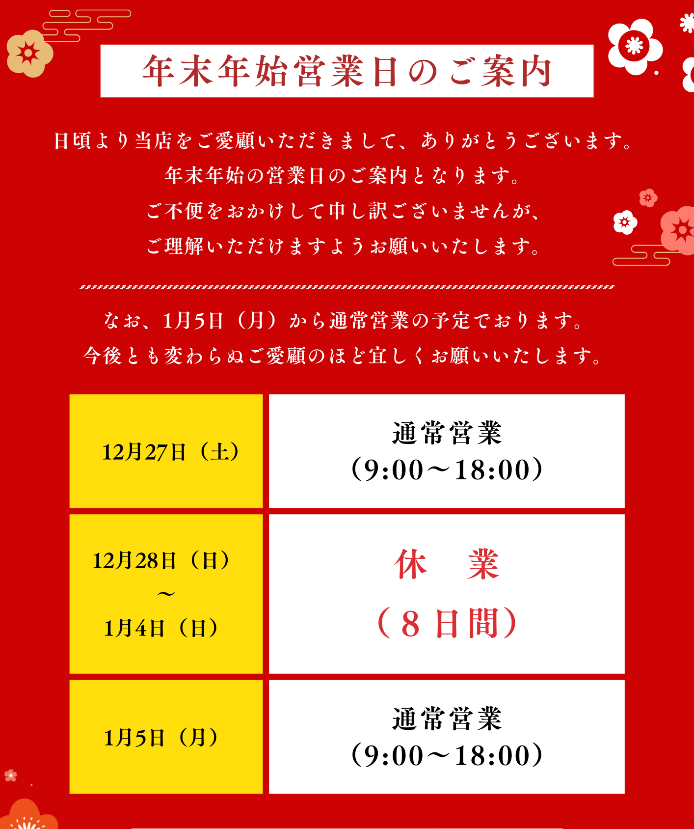 - 2025年12月27日(土) 通常営業(9:00~18:00)