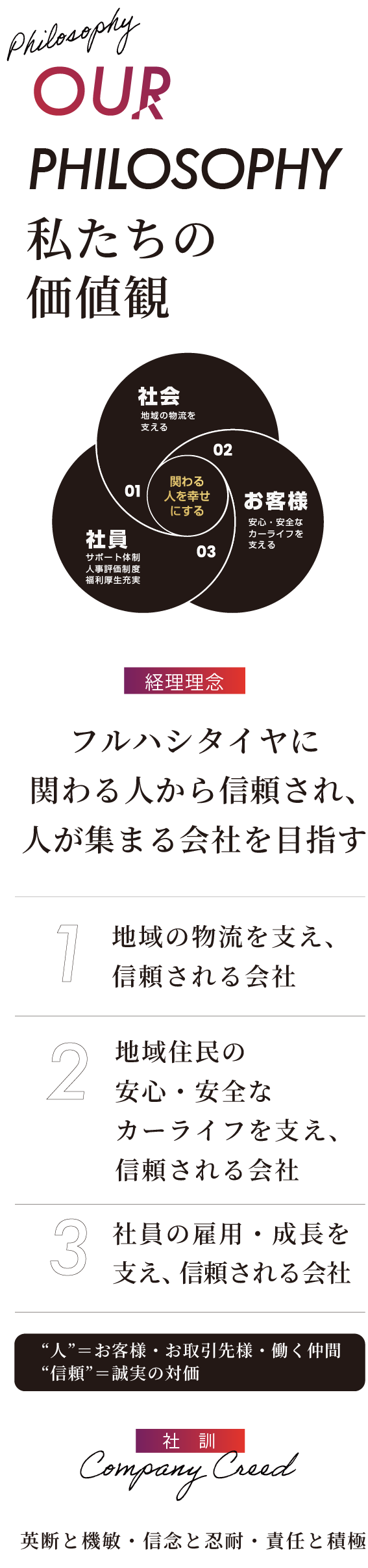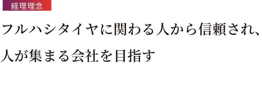 創業75周年を迎えたフルハシタイヤは、お客様の安心・安全・快適なカーライフを、社員の幸せとともに実現していきます。「人」が集まる会社として、お客様、社員、そしてその家族、取引先様すべての幸せを追求し、社会貢献に努めてまいります。これからも、変化を恐れずに挑戦を続け、100年企業を目指します。